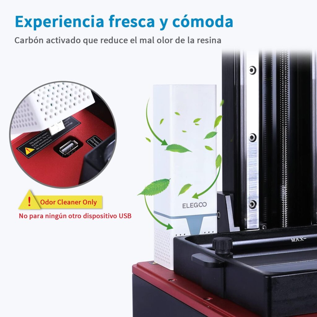 Experiencia de Usuario Mejorada Incluye un purificador de aire que reduce el olor de la resina y garantiza una experiencia de usuario más agradable y fresca. Nota: el puerto USB cerca del purificador de aire solo se utiliza para el mismo propósito.