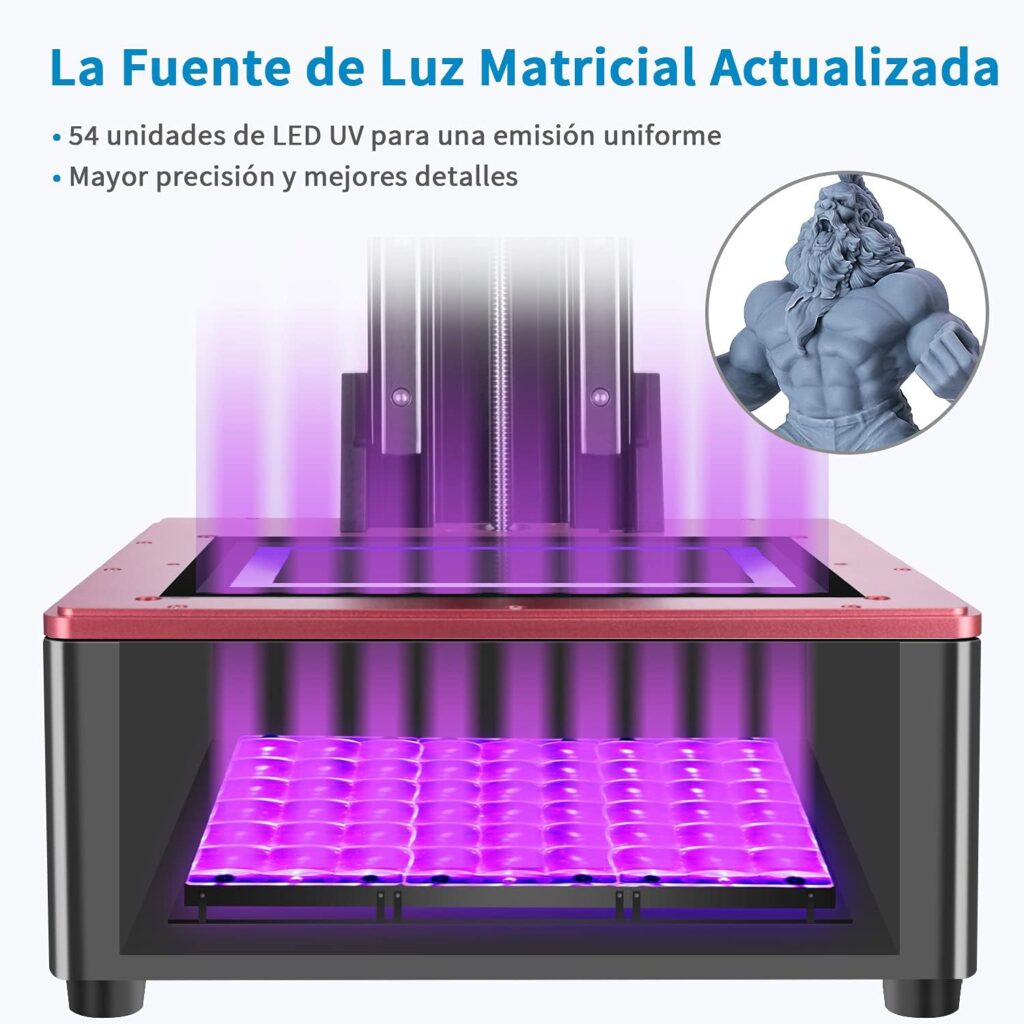 Calidad de Impresión Sobresaliente Cuenta con una matriz de luz LED mejorada que distribuye la luz UV de manera uniforme y una estructura de guía lineal doble para un movimiento más estable. La película FEP 2.0 más delgada permite una mejor adherencia del modelo sin delaminación.